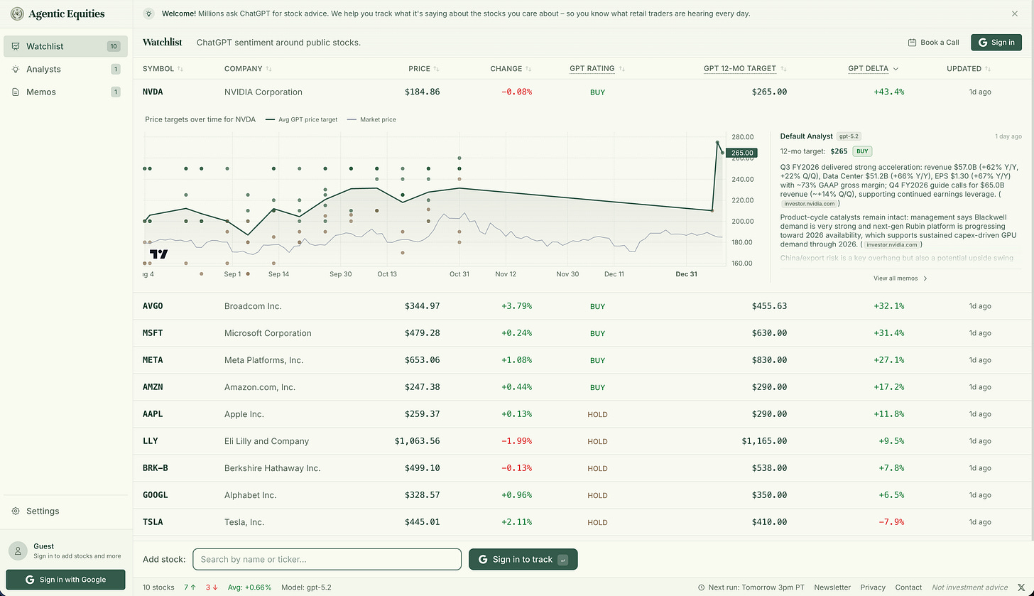 People are increasingly asking ChatGPT for investment advice, but there’s no way to monitor this market-moving activity systematically. Agentic Equities began in August 2025 as a proof of concept to solve this problem.